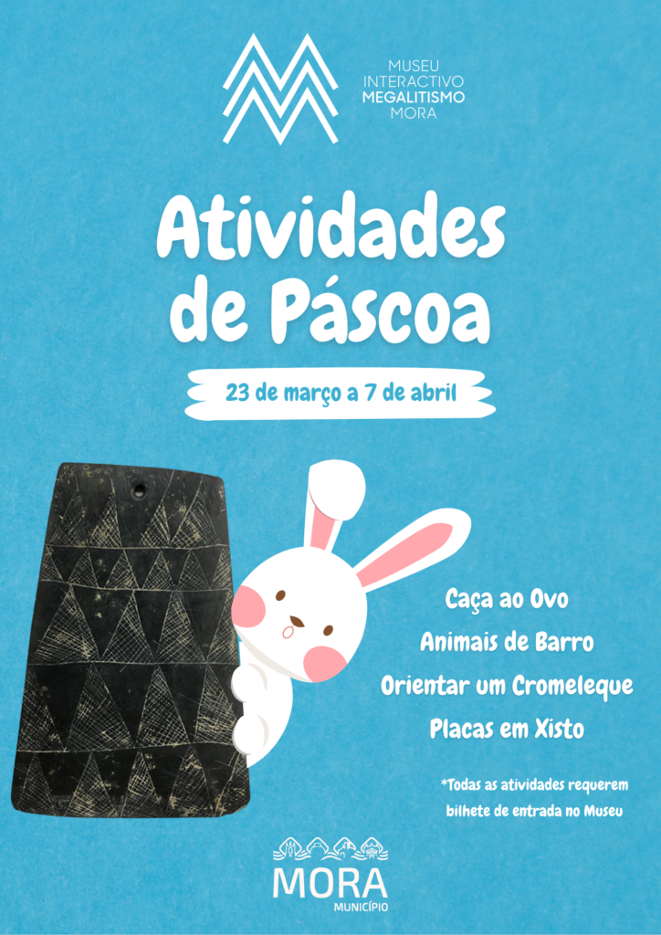“Caça ao Ovo”, “Animais de Barro”, “Orientar um Cromeleque” e “Placas de Xisto” são as atividades alusivas à Páscoa, disponíveis de 23 de março a 7 de abril, no Museu Interativo do Megalitismo de Mora.